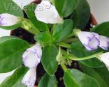 Облачко белых с синим кантом колокольчиков на заостренной зеленой листве. Удлиненная зеленая листва.