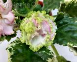 Крупные белые цветы с розовым румянцем, украшены волнисто-гофрированной салатовой каёмочкой. Пышное цветение, средне зелёные листья. Лучший вариант цветения получатся при естественном освещении. |