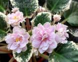 Крупные махровые волнистые нежно-розовые звезды с тонкой зеленой каймой. Обильное цветение.