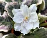 Nik-Ликование Весны Полумахровые белые цветы с зелёным напылением по краю лепестков и розовыми тенями. Пестролистная ровная розетка.