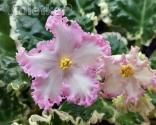 Nik-Обыкновенная Богиня Белые цветы с яркими гофрированными розовыми краями, шапочное цветение, пестролистная розетка.