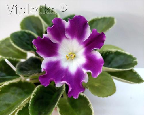 Очень крупные полумахровые фуксиевые звезды с широким белым глазком на пестролистной розетке.