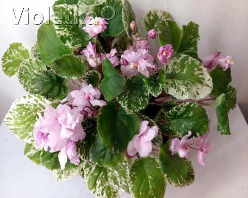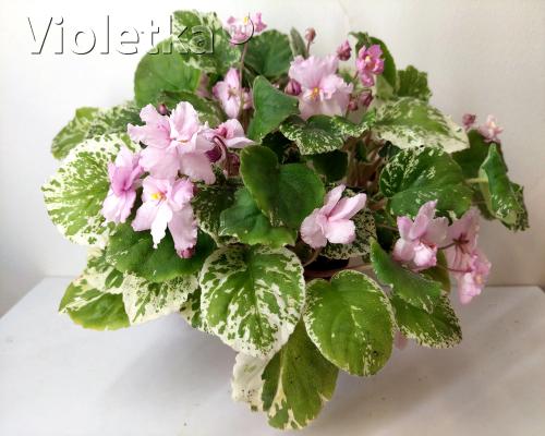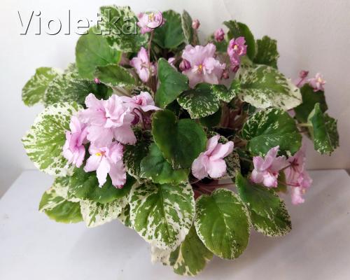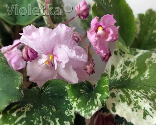Нежно кремово-розовые полумахровые цветы на красивейшей пестролистной розетке. Стандартный трейлер.