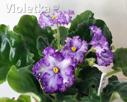 Крупные светло-сиреневые звезды с густо-бахромчатым темно-фиолетовым краем лепестков. Компактная розетка из зелёных волнистых листьев.