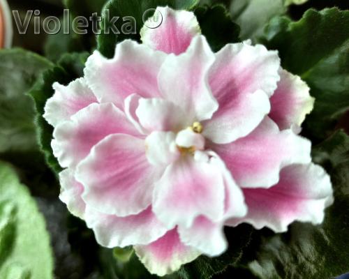 Очень крупные махровые бело розовые цветы на компактной розетке с гëрл листвой. Розовый цвет очень нежный и в сочетании с белым смотрится нарядно. Стандарт.