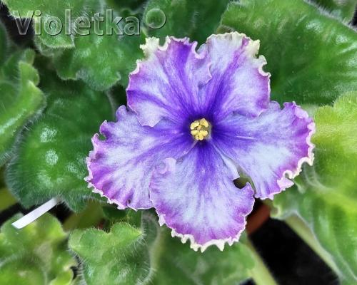 В начале роспуска цветы светло сиреневые, потом появляется фактурность, напоминающая венозность. К моменту взросления, цветы заметно светлеют, становятся почти белыми. На цветоносе до 8 цветов. По краю лепестков очень густой зелёный рюш, не зависящий от температурного режима. Обильное, очень длительное цветение. Светло-зелёная волнистая стёганая листва, зубчатый край.Цена: 150руб.