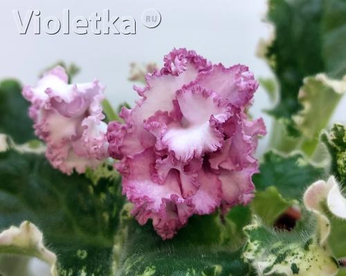 Крупные белые цветы формы розы с переходом в пепельно-розовый и эффектным фэнтези в виде мелких штришков темно-розового цвета. В центре цветка сгущение розового цвета которое при определенных условиях может растекаться на весь цветок. Интенсивность и количество розового вариативно в зависимости от температуры. Край лепестков рифлёный. Пестролистная листва.Цена: 250руб.