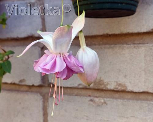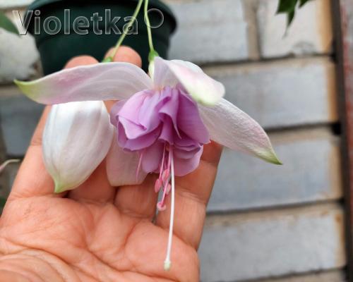 Ампельный сорт. Бутоны очень крупные продолговатые. Чашелистики белые с розовым напылением. Юбочка сиреневая. Цветы густомахровые, очень крупные.Цена: уточняйте наличие