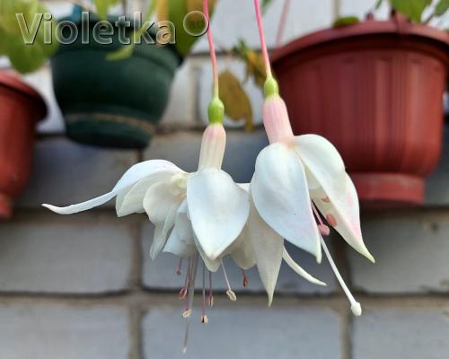 Ампельная форма. Бутоны продолговатые. Цветы очень крупные, густомахровые. Чашелистики бело-кремовые. Юбочка бело — кремовая.